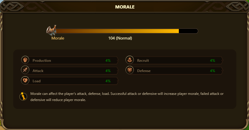 Winning against other players in attacking or defending battles increases morale by **2** points, while losing decreases morale by **2** points.&#x20;